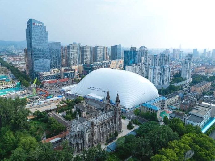 In Licheng district, Jinan, east China’s Shandong province, a massive “white cushion” structure at the “Honglou 1905” urban renewal project has recently drawn attention.